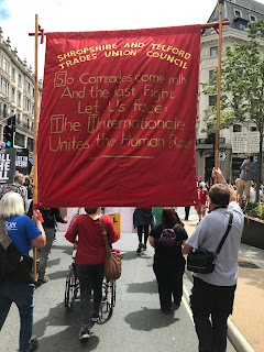 The march commenced at 13:30, occupying the public highway for half its length, the RTUC banner displayed in its magnificent splendour, carried by John Partington and its designer, Nick Hatton (UCU).
